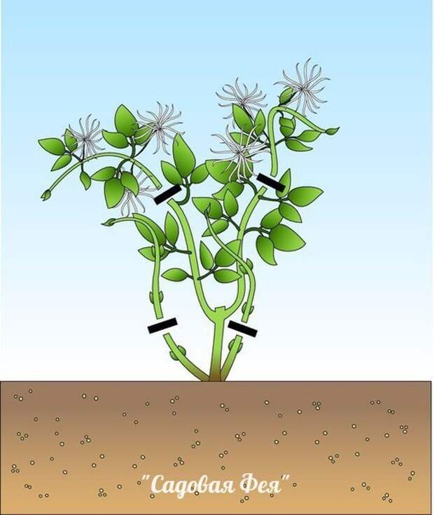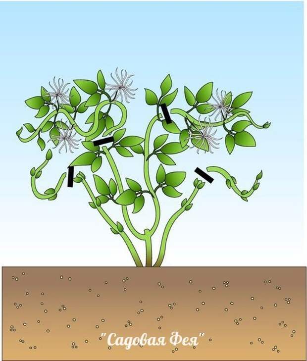 Без укрытия у клематисов этих групп вымерзают почки, чаще это случается после холодного лета. У клематисов 2-й и 3-й групп на оставшейся лозе обрезают листья и укладывают ее на еловые лапы. Оставленные побеги весной можно использовать для размножения.