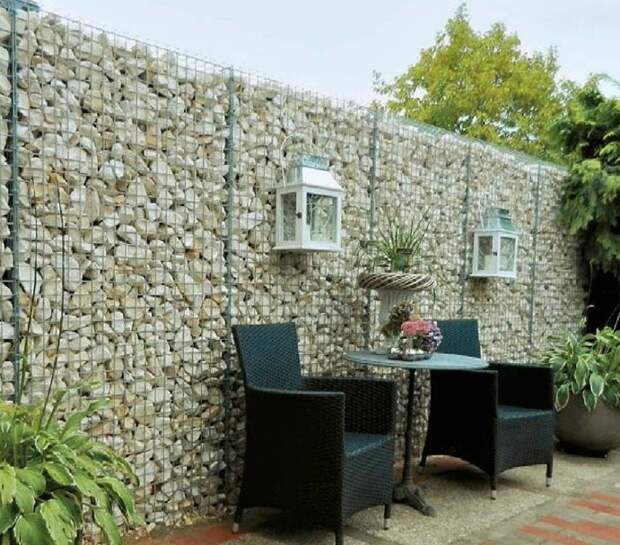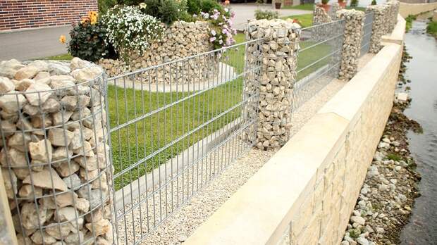 Интересный вариант забора из габионов. Габионы делаются из камней и сетки-рабицы. Чаще всего из сетки формируется коробка с прямоугольными стенками, внутри которой помещаются бутовые камни размером больше отверстий сетки на 30-40%. Габионы можно сочетать с деревянной частью, каменной или профнастилом.