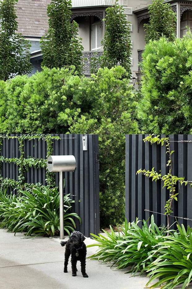 Большинство на дачах используют забор из профнастила. Он недорогой и хорошо защищает от посторонних взглядов, создает уединение, но не очень красив. Есть вариант сочетать профнастил с кирпичом для большей привлекательности.