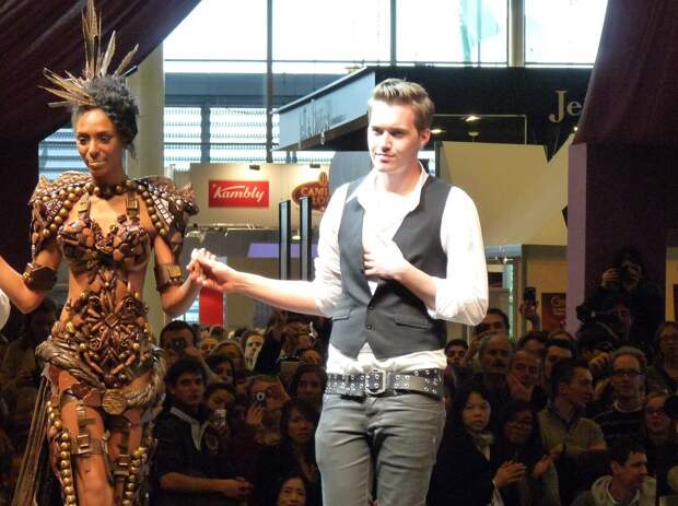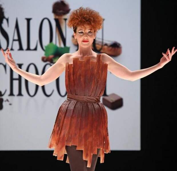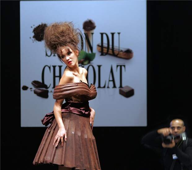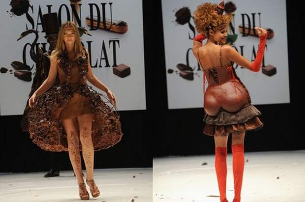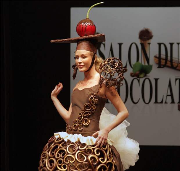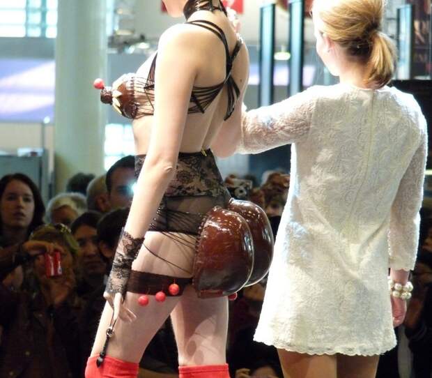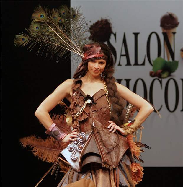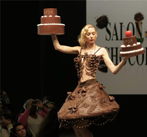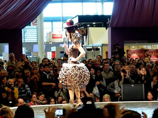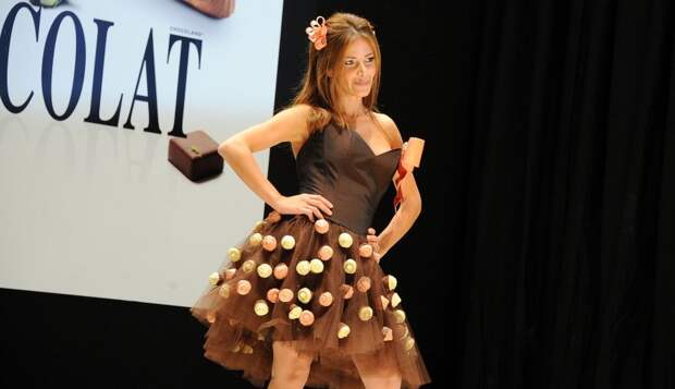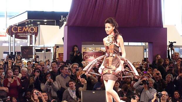 В рамках выставки проводят также ежегодный показ мод, наряды которого сделаны из разнообразных сортов шоколада.