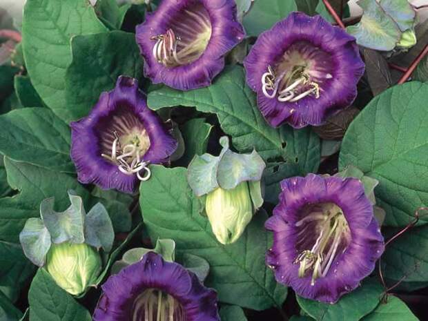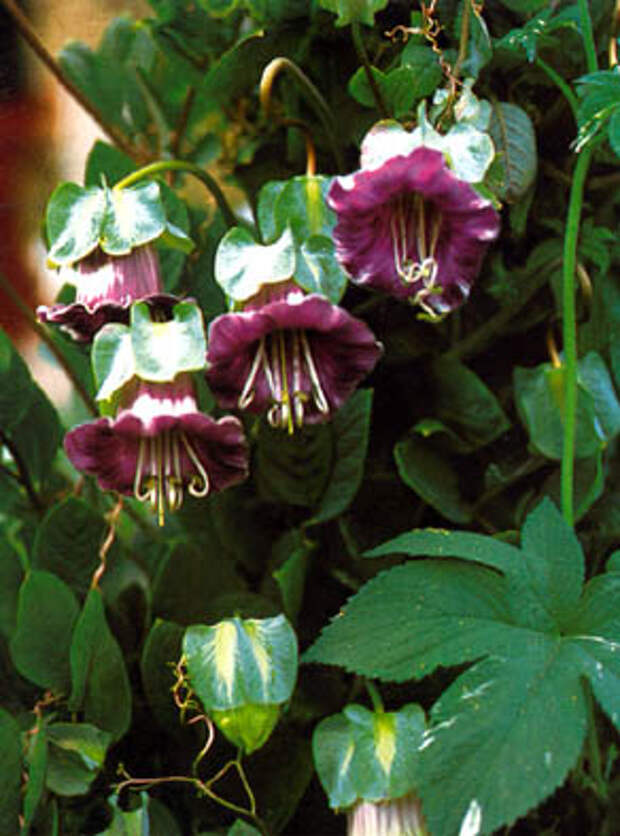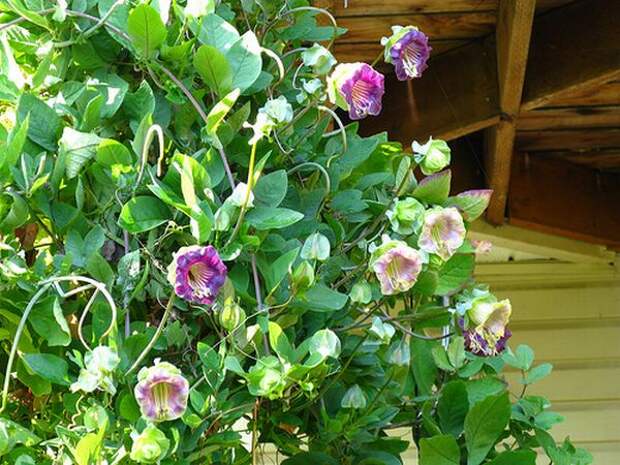 Кобея лазящая (Cobaea scandens) теплолюбива, образует изящные крупные цветки. Растение это очень декоративно. Если хотите увидеть ее цветки ещё раньше – заботы о рассаде придётся начинать с конца февраля. Прорастают семена кобеи довольно медленно (иногда больше месяца), да и развивается это растение в первое время не слишком быстро. Сеять семена нужно довольно мелко и внимательно следить, чтобы почва не была переувлажнена, иначе семена загниют. После окончания весенних заморозков рассаду кобеи закаливают и осторожно (без повреждения корневого кома.) высаживают в открытый грунт. Кобея – неженка, а потому лучшим местом ей будет южная стена дома, где много солнца и нет холодных ветров. Нужно соорудить для её побегам опору (около 3 м высотой) и обильно поливать кобею в засуху; переудобрение растения нежелательно. Несмотря на всю свою нежность, кобея в отличие от большинства однолетних лиан первые осенние заморозки переносит легко.