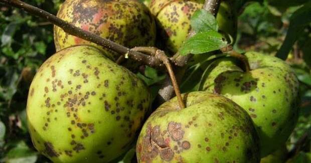 Делают это летом и осенью, до весны не откладывают. В данный момент, чтобы хоть в какой-то степени сохранить урожай, есть только один выход — собрать недозревшие плоды. Это лучше, чем после обработки травиться самим — ведь уже конец августа. Заниматься спасением урожая надо с ранней весны. До набухания почек, когда температура воздуха будет плюс 4 градуса и выше, проводят обработку 3-процентной бордоской жидкостью (300 г медного купороса и 300 г извести на 10 л воды).