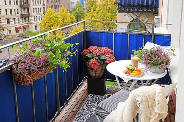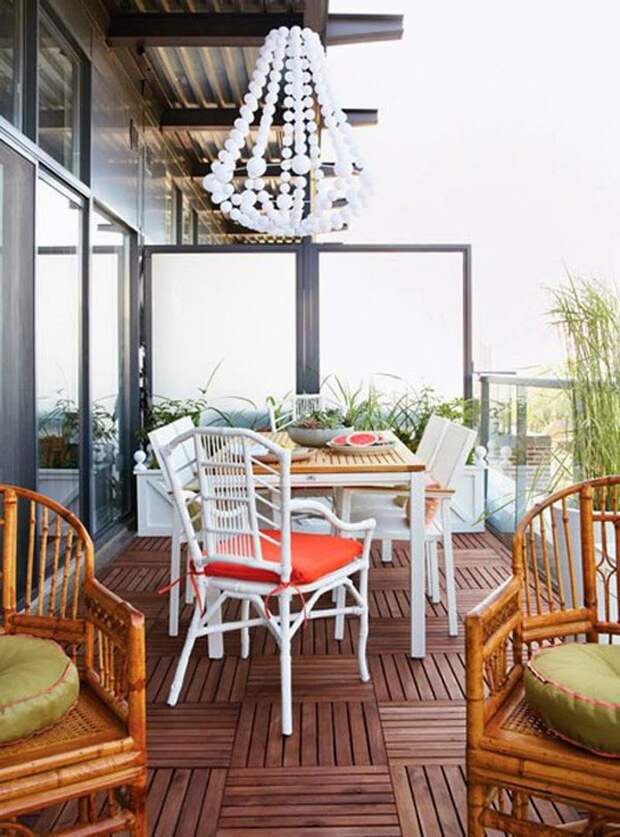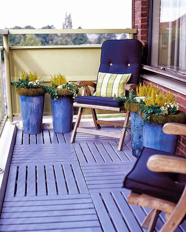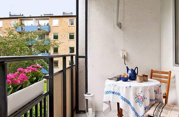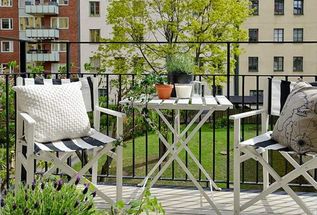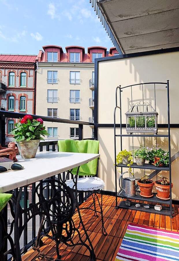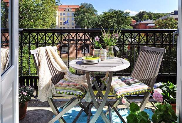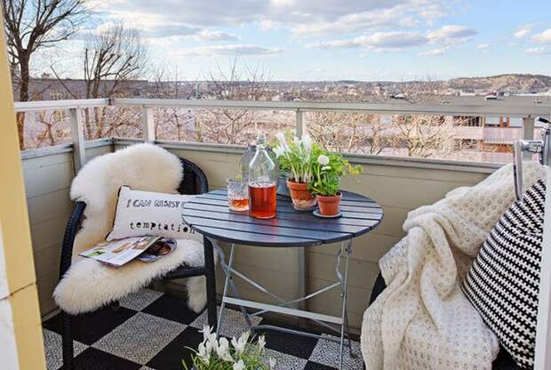 Не следует загромождать балкон мебелью, особенно если он совсем небольшой. Поставьте столик с несколькими стульчиками или сделайте что-то вроде диванчика с одной стороны. Удобно будет использовать складывающиеся предметы мебели, чтобы была возможность прятать их до следующей весны.