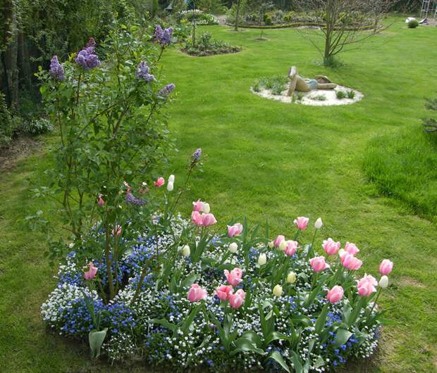 Всё началось с того, что наши знакомые любезно предложили пустующую землю на берегу речки под посадку овощей и зелени к столу. Пришлось немало потрудиться, чтобы вручную очистить участок от вековых зарослей ежевики и поваленных деревьев. Появились грядки, появились помидоры и картошка, и совсем маленькая полоска цветов. Большой радостью было, когда узнали, что знакомые могут продать нам этот участок. Не дожидаясь, пока закончится оформление документов у нотариуса, начали подготовку к разбивке сада. Завезли десять самосвалов земли для устройства горки и выравнивания площади под газон. Это было в 2003 году. Облик сада меняется из года в год, подрастают деревья, расширяется ассортимент тюльпанов, роз и других растений, добавляются новые скульптуры.