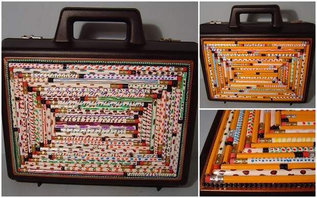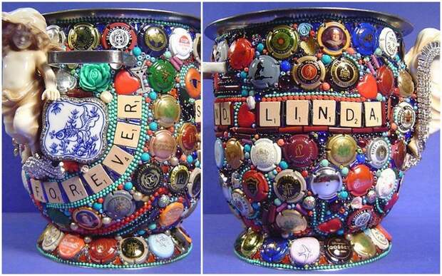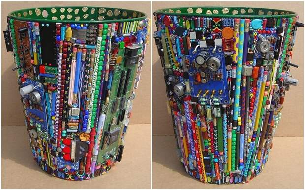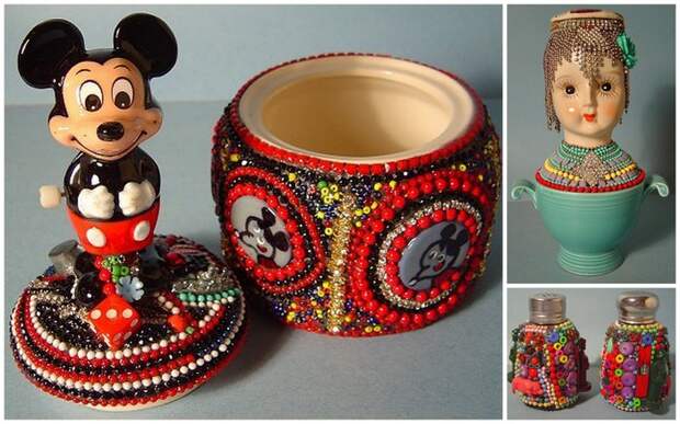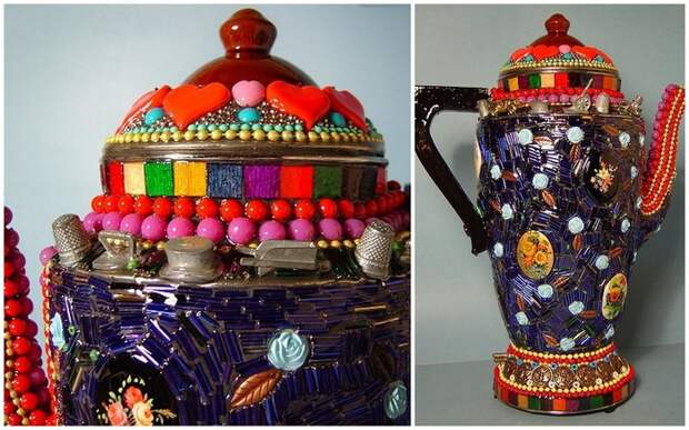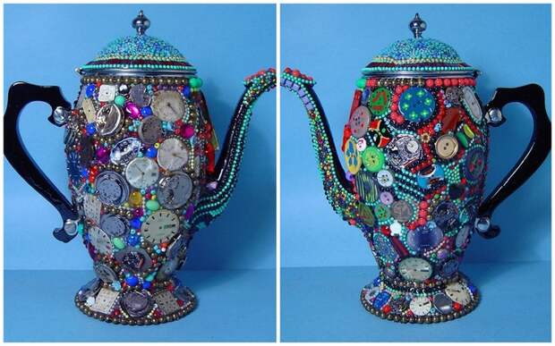 Подобные мозаики очень интересно рассматривать. В основе - самые обычные предметы нашего обихода: ведра для бумаг, старый кейс, чайники, шкатулки. Мозаика же состоит из пуговиц, бусин, бисера, игрушек, монет, бижутерии, значков, карандашей и прочей "мелочевки", которая найдется в каждом доме.