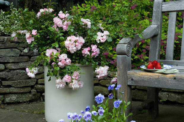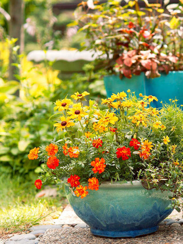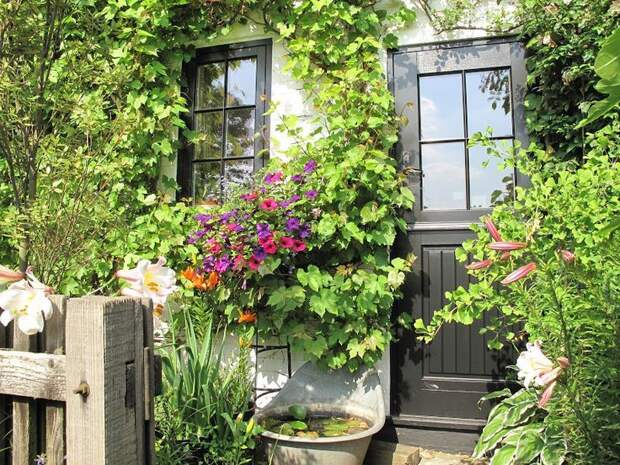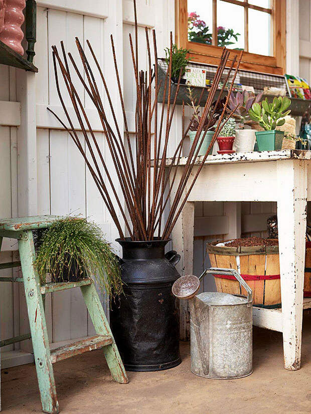 Очень уместно смотрятся цветочные растения или декоративные овощные культуры в жестяных емкостях – прохудившихся ведрах, бидонах, лейках. Хорошо бы, чтобы все ваши «поделки» такого рода сопровождал элемент юмора.