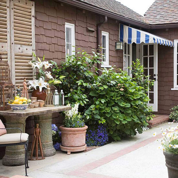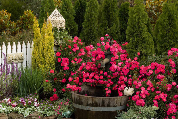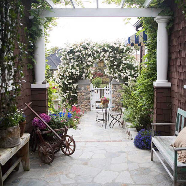 Однако коттеджный сад – это не только плодовые деревья, яркие пышноцветущие растения, красивые красные перцы, помидоры, грядки салатов, зеленных культур и весьма графичные тыквы. Это своего рода царство аксессуаров. Самые распространенные элементы, часто называемые «американизмами» – это колеса от телеги, соломенные чучела и декоративные статуэтки. Их не должно быть много, иначе сад будет выглядеть чрезмерно перегруженным деталями, ненастоящим. Гораздо большую прелесть ему придадут красиво сделанный колодец, яркая скамейка у входа в дом, мощеная терраса, увитая девичьим виноградом, или беседка в укромном уголке. Решив поставить рядом с клумбами декоративную тележку, хорошо продумайте композицию растений, которая будет ее украшать.