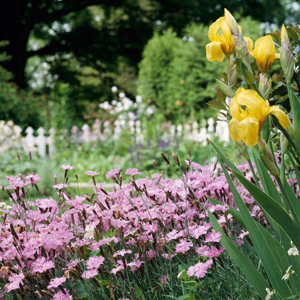 Весной здесь распускаются тюльпаны и нарциссы, затем эстафету цветения принимают кустарники, среди которых самые крупные и обладающие ярким, густым ароматом – сирень и жасмин. Лето – царство розовых кустов и гортензии, ближе к концу теплого сезона доминантой сада становятся флоксы. Очень хороша в эту пору садовая гвоздика. Уместны здесь и маки, и яркие оранжевые капуцины (настурция). На довольно запущенных лужайках, назвать которые газонами не поворачивается язык, вполне могут вырасти клевер, колокольчики и даже одуванчики. А вот крупноцветковые сорта ирисов и обожаемые многими клематисы не совсем уместны. Осенью владельцев такого сада порадуют астры и большие яркие клумбы, доминантой которых могут быть георгины, рудбекия, гелениум. Хорошо смотрятся ярко-желтые заросли топинамбура и «золотые шары» вдоль забора.