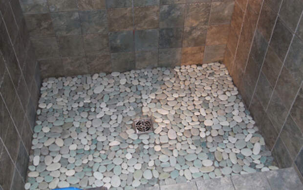 Прежде чем приступить к облицовке полов ванной комнаты речной галькой убедитесь, что основа (пол) находиться в надлежащем состоянии. Т.е. ровный ли он, если нет, то стоит его подготовить к монтажу.