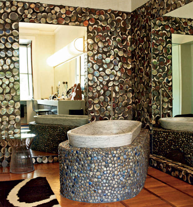 Сейчас гальку используют в качестве напольного покрытия и для облицовки стен в ванных комнатах, для защитных панелей в кухне, вокруг бассейнов и каминов…