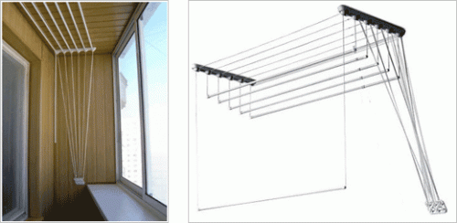 Архитекторами была сконструирована потолочная сушилка. Она работает по принципу выдвижной вешалки, которая нередко устанавливается в шкафах- купе.