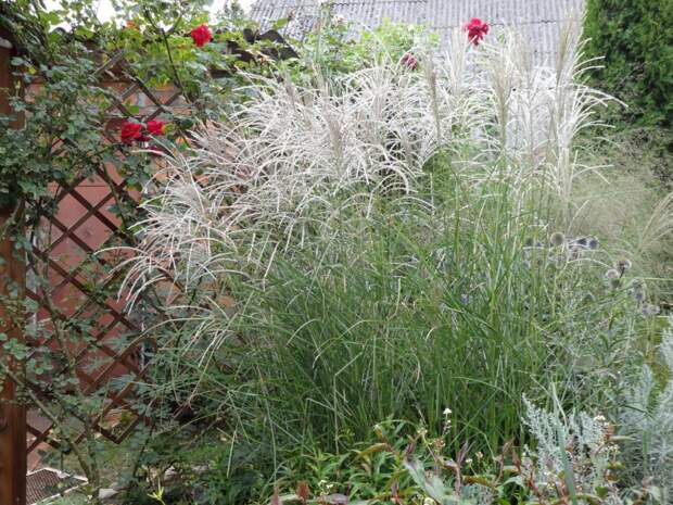 Садик трав. Растут мискантусы сортов Зебринус, Якияма, райграс бульбоносный, осоки, просо сорта Прейри Скай, вейники сортов Карл Фостер и Овердам,овсяницы,офиопогон, императа и другие.